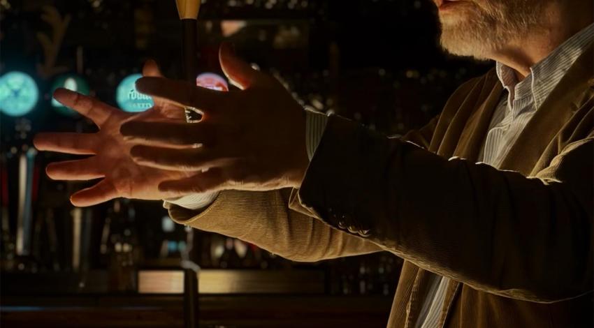 Foto: in volle inspanning met de toog van een bruine kroeg als laatste steun en toeverlaat